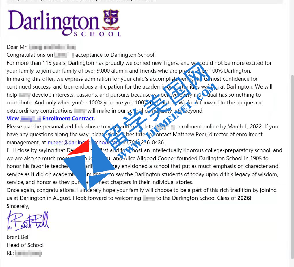 恭喜留学美国网L同学收获Darlington School的录取!Darlington School成立于1905年,是一所位于佐治亚州的寄宿学校。在达林顿学校,学生是学校一切工作的核心,学校有许多以学生为中心的教学项目,如教学中心、品格教育和领导力项目,以及价值九千万美金的“第二个世纪战略计划”。再次恭喜L同学!
