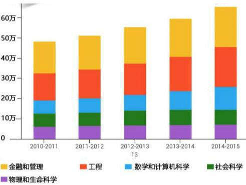 美国《门户开放报告》中有一项专门针对国际学生所学专业的统计。从2012—2013学年到2014—2015学年三年的数据来看,中国学生选择专业的倾向十分明确且稳定:最受欢迎的是商科,每年都有四分之一以上的人学习商科,在2014-2015学年,这部分学生的总人数超过8万。