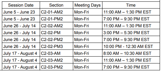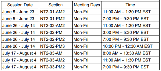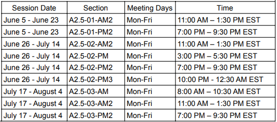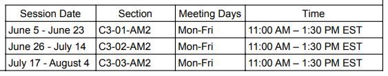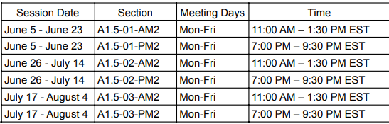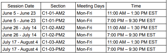 被我们的暑期课程录取的学生决定他们想参加的时间以及他们想在每个课程中注册多少门课程。学生可以报名参加一个或多个课程,并且在一个课程中没有最低或最高课程数限制。上课模式如下:
