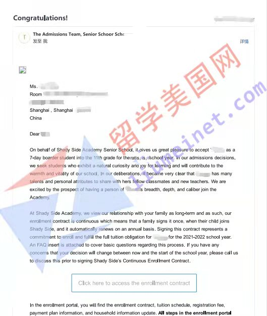 M同学本身的优秀和积极进取,外加我们团队老师的帮助引导,最终成功斩获桑迪赛德学院Shady Side Academy的录取offer!
