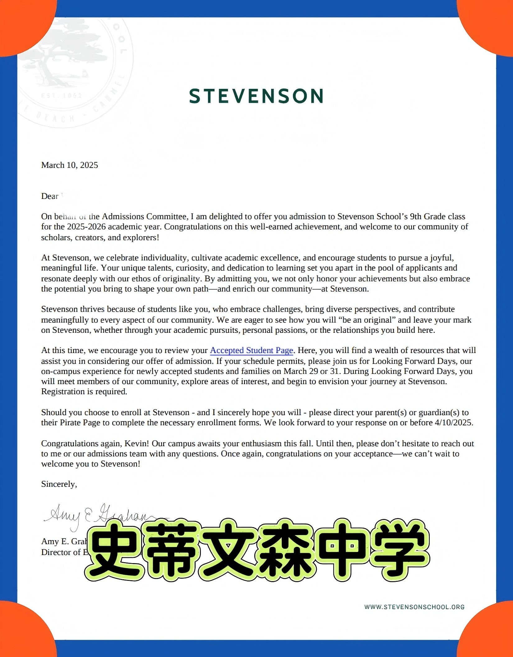 恭喜留美网H同学收获史蒂文森中学录取offer!