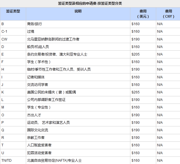 最常见的非移民类型签证申请费为160美元,其中包括旅游、商务、学生和交流访问学者签证。大部分基于批件 (petition)的签证费用为190美元,比如工作和宗教签证;K类和E类签证分别为265美元和205美元。