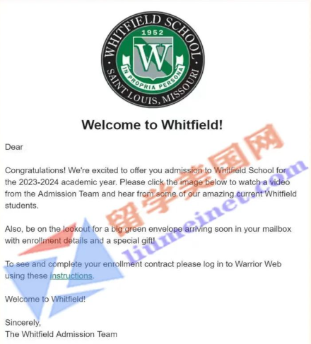 录取喜报,恭喜留美网L同学斩获惠特菲尔德学校Whitfield School录取!Whitfield School位于美国密苏里州圣路易斯,对于6-12年级的学生来说,这所学校是一个紧密团结和多样化的社区。在这里,每个学生的优势都被了解、培养和赞美。